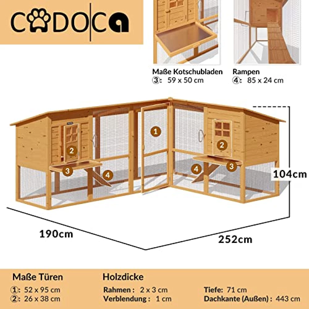 Stell dir vor, deine Kaninchen, Hasen oder Meerschweinchen hätten ihr eigenes Schloss – mit Gartenblick, Sonnenterrasse und privatem Rückzugsraum. Genau das bietet der CADOCA XXL-Kleintierstall! Hier wird nicht nur gewohnt, sondern gehoppelt, gebuddelt und genascht, was das Zeug hält. Das großzügige Maß von 443x102x104 cm macht Schluss mit beengtem Alltagstrott und eröffnet deinen Tieren eine Welt voller Möglichkeiten. Zwei Etagen, verbunden durch eine Lauframpe, laden zum Entdecken ein, während das massive Holz und das wasserdichte Bitumendach jedem Wetter trotzen. Und falls du dachtest, das war’s schon: Die cleveren Türen mit Riegeln und Schiebereglern sorgen dafür, dass nur die richtigen Pfötchen den Weg ins Freie finden. Willkommen im tierischen Luxus!