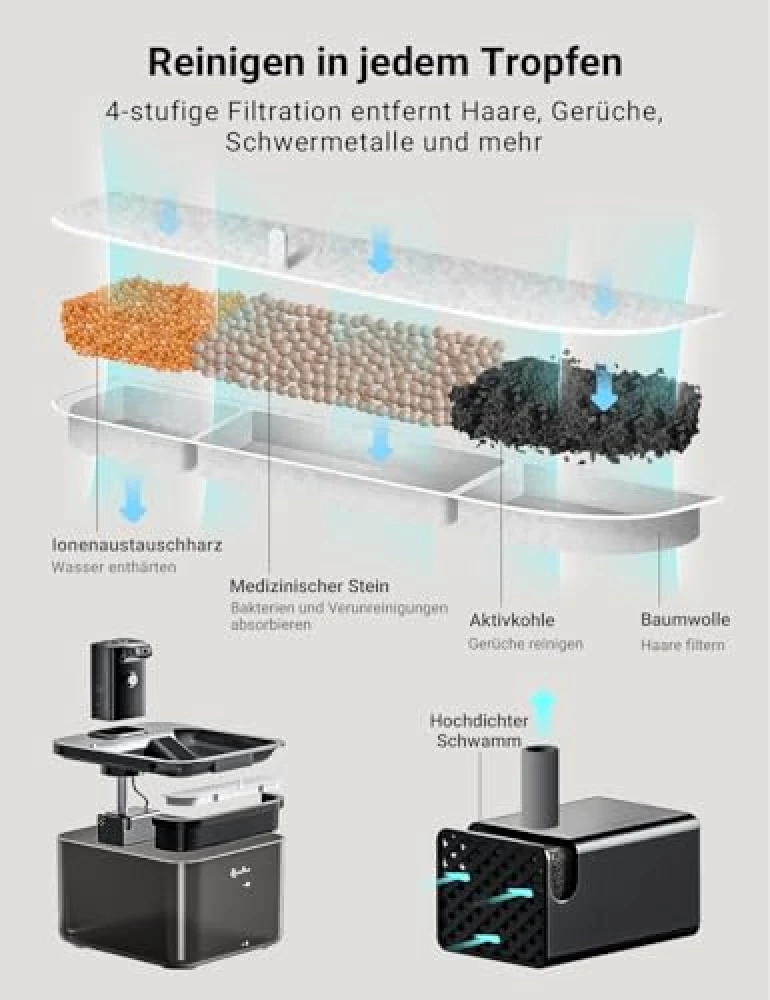 Wer mehr als eine Samtpfote zuhause hat, weiß: Hygiene ist alles – besonders bei Wasserstellen. Der DownyPaws Katzenbrunnen ist ruckzuck zerlegt, lässt sich einfach reinigen und punktet mit einem 5-stufigen Filtersystem, das sogar Feenwasser Konkurrenz macht. Aktivkohle, Ionentauscher, medizinischer Stein – das klingt fast wie Alchemie, ist aber pure Trinkwasserliebe. Sogar Haare und Kleinteile haben dank Vliesfilter keine Chance.