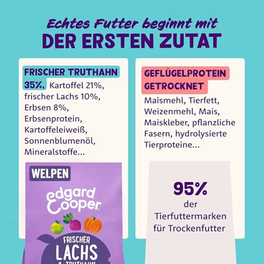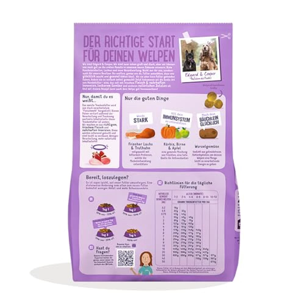 Verwöhne deinen Welpen mit unserem natürlichen Trockenfutter, das frischen Lachs und Truthahn vereint. Getreidefrei und voller Nährstoffe, unterstützt es die Verdauung und das Immunsystem. Plus: Mit jedem Kauf hilfst du Tieren in Not! Entdecke die Freude am Füttern!
