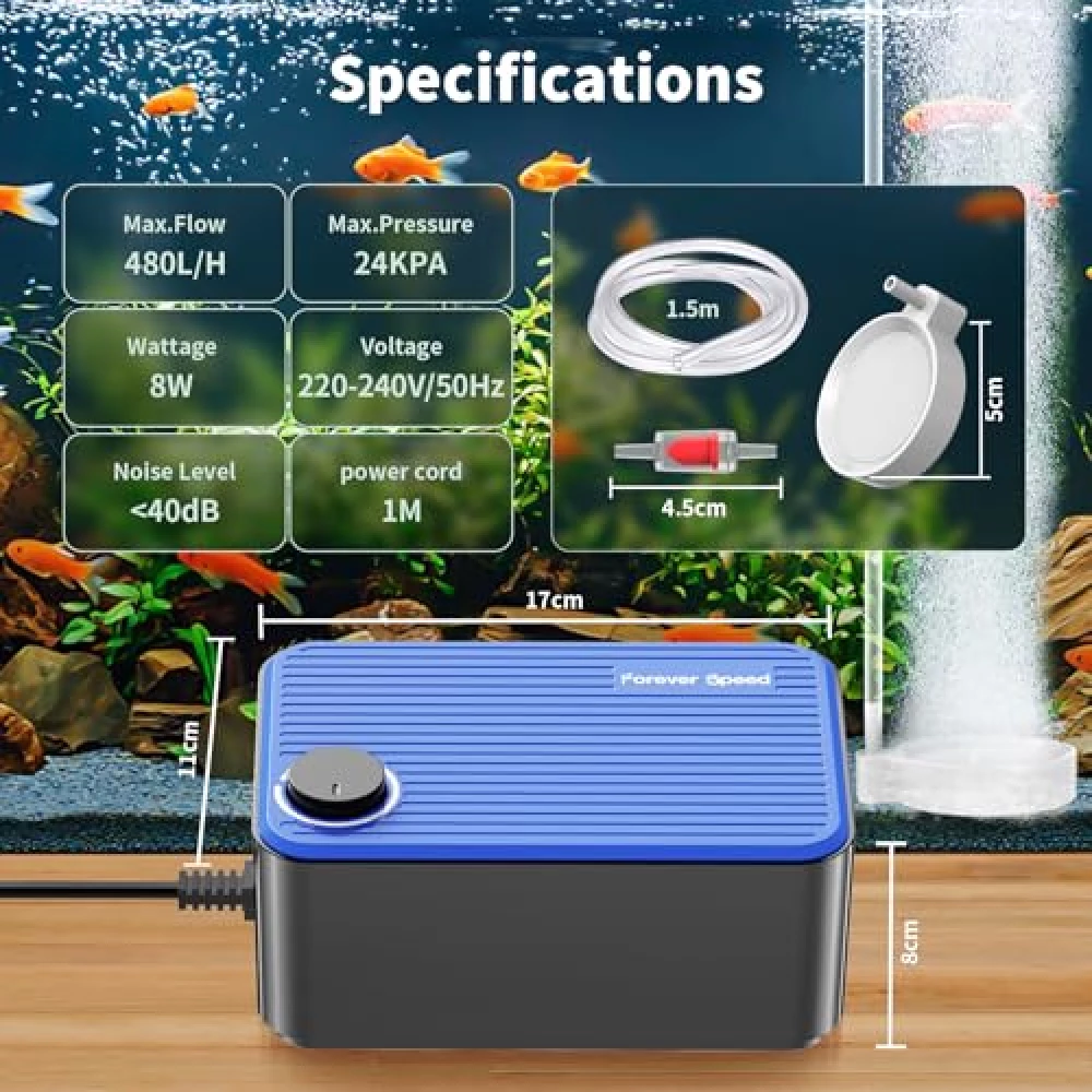 Ob 80-Liter-Nano-Aquarium oder 600-Liter-Meerwasserpalast – diese Luftpumpe fühlt sich überall wohl. Mit einer maximalen Förderleistung von 480 Litern pro Stunde und einem Druck von 24 KPa ist sie für fast jedes Becken gewappnet. Die Installation ist kinderleicht, und dank des robusten Gehäuses bleibt die Pumpe auch bei längerer Nutzung zuverlässig und leise. Egal ob Süß- oder Meerwasser, Steingarten oder sogar ein Pool für Meeresfrüchte – diese Pumpe ist der Joker für alle, die Wert auf Ruhe, Leistung und Flexibilität legen. Und das Beste: Die Reinigung geht schnell von der Hand, damit du mehr Zeit für die wirklich wichtigen Dinge hast – wie das Beobachten deiner glücklichen Fische.