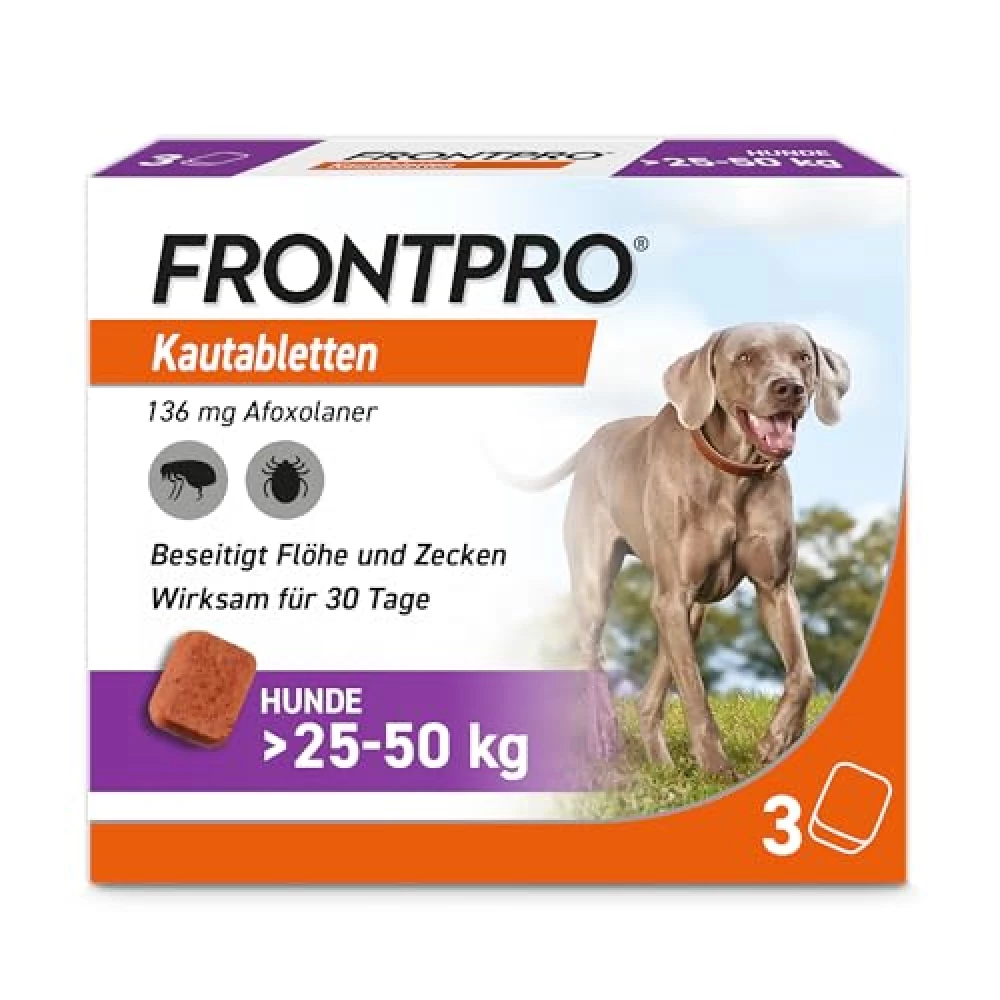 Die Kautablette ist für Hunde zwischen 25 und 50 kg gedacht. Für kleinere Hunde gibt es jedoch spezielle Produkte – frag einfach deinen Tierarzt nach der besten Lösung für deinen kleinen Freund.