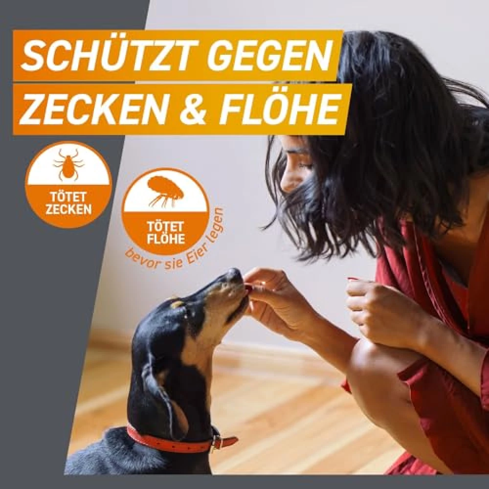 Für optimalen Schutz reicht es, deinem Hund einmal im Monat eine Kautablette zu geben. So bleibt er drei Monate lang vor Zecken und Flöhen geschützt. Einfach und effektiv!