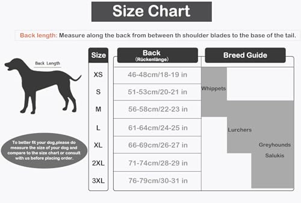 Am besten misst du deinen Hund genau und orientierst dich an der Größentabelle. Falls es doch nicht passt, empfehlen wir, die Größe um 1–2 cm kleiner zu wählen. So sitzt der Mantel wie angegossen.