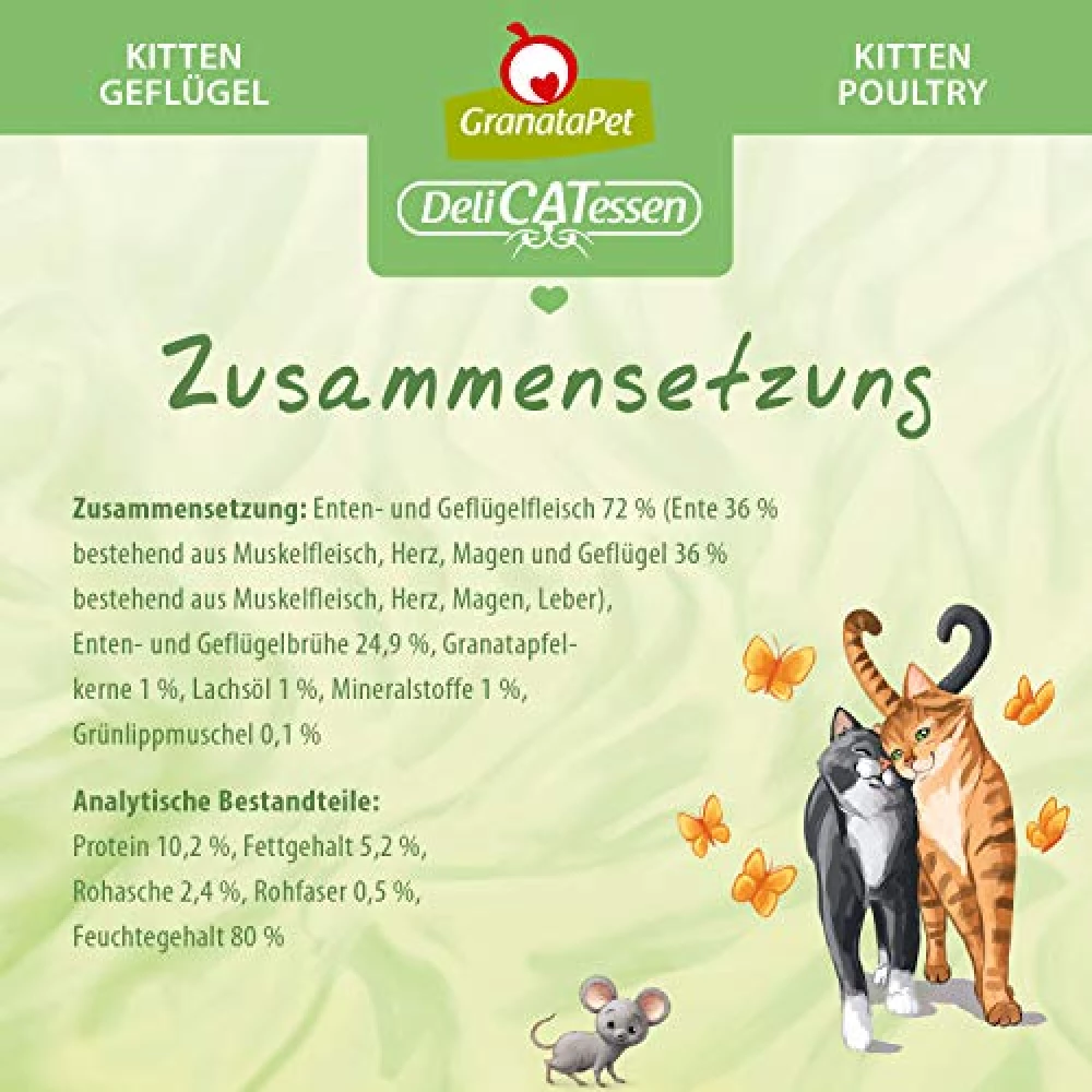 Die besonderen Inhaltsstoffe machen das DeliCatessen Kitten Geflügel zu einem echten Gesundheitsboost für deine Katze. Die enthaltenen Granatapfelkerne sind reich an Antioxidantien und unterstützen das Herz-Kreislaufsystem deiner Samtpfote. Und die Grünlippmuschel? Die schützt die Gelenke und sorgt dafür, dass dein kleiner Wirbelwind auch im Alter noch flink und agil bleibt. So wird das Futter nicht nur zu einer täglichen Freude, sondern auch zu einer sinnvollen Investition in die Gesundheit deiner Katze.