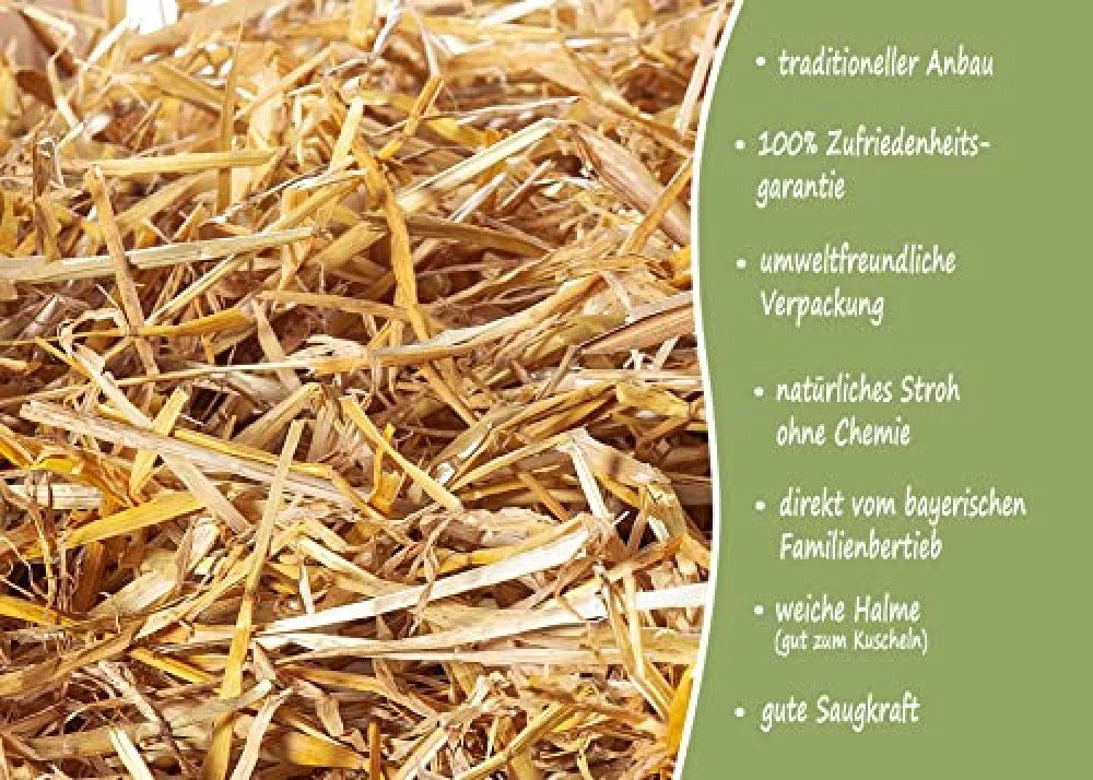 Bei trockener Lagerung bleibt das Stroh viele Monate frisch und schmackhaft. Es ist wie ein kleiner Vorratsschrank für deine Tiere!