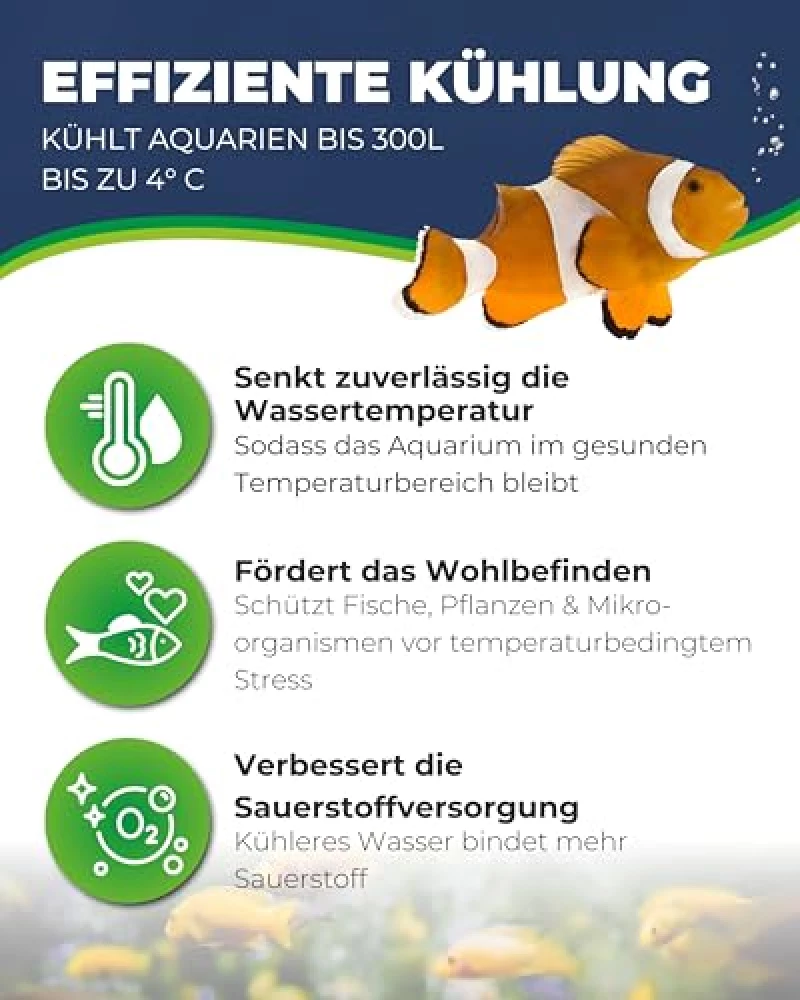 Der Lüfter kann die Wassertemperatur um bis zu 4 °C senken. Wie viel es genau wird, hängt von der Raumtemperatur, der Verdunstungsrate und der Größe deines Aquariums ab. Deine Fische werden es dir danken – vor allem an heißen Sommertagen!