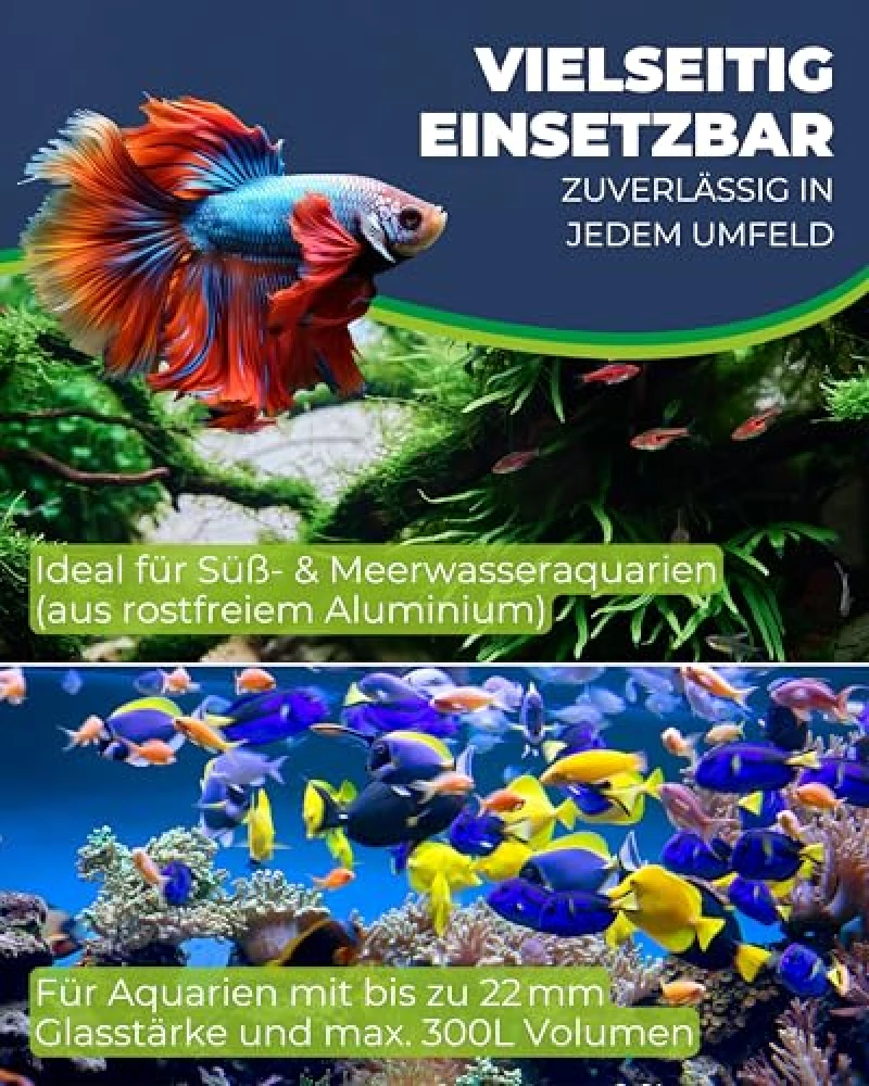 Salzwasser kann ganz schön tückisch sein – nicht aber für diesen Lüfter. Gefertigt aus rostfreiem Aluminium, trotzt er selbst den wildesten Wellen und bleibt dauerhaft einsatzbereit. So bleibt dein Meerwasseraquarium auch langfristig ein Wohlfühlort für Korallen, Fische und alle, die das Salz in der Luft lieben. Und falls du ein Süßwasseraquarium hast: Keine Sorge, auch hier zeigt sich das Material von seiner besten Seite. Robust, langlebig und pflegeleicht – so macht Aquaristik Spaß, ohne dass du ständig an Ersatz denken musst.