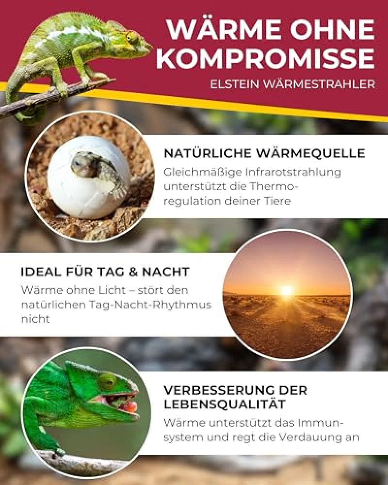Hinter diesem Heizstrahler steckt echte Terraristik-Erfahrung aus drei Generationen. Das merkt man nicht nur an der Qualität, sondern auch an den kleinen Details, die den Alltag leichter machen: einfache Montage, zuverlässige Funktion mit Thermostat und eine Wärmeleistung, die selbst anspruchsvolle Reptilien zufriedenstellt. So wird dein Terrarium zum Wohlfühlort – und du zum entspannten Tierhalter, der sich auf das Wesentliche konzentrieren kann: das Abenteuer Terrarium.