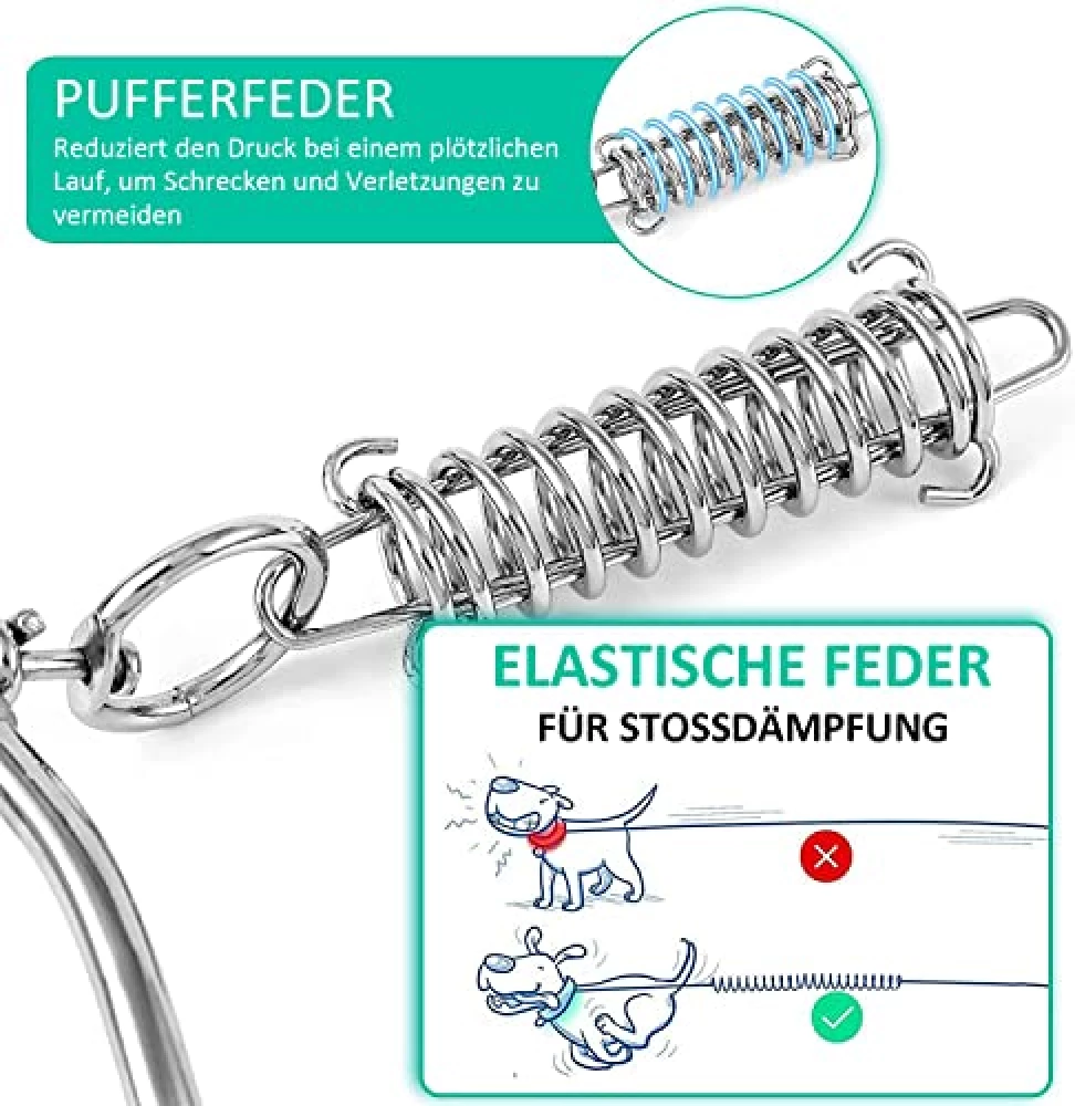 Die Feder ist wie ein unsichtbarer Bodyguard für deinen Hund: Sie nimmt die Wucht auf, wenn dein Hund plötzlich losprescht oder am Ende der Leine ankommt. Das schont die Gelenke und sorgt für ein entspanntes Toben – ganz ohne böse Überraschungen.