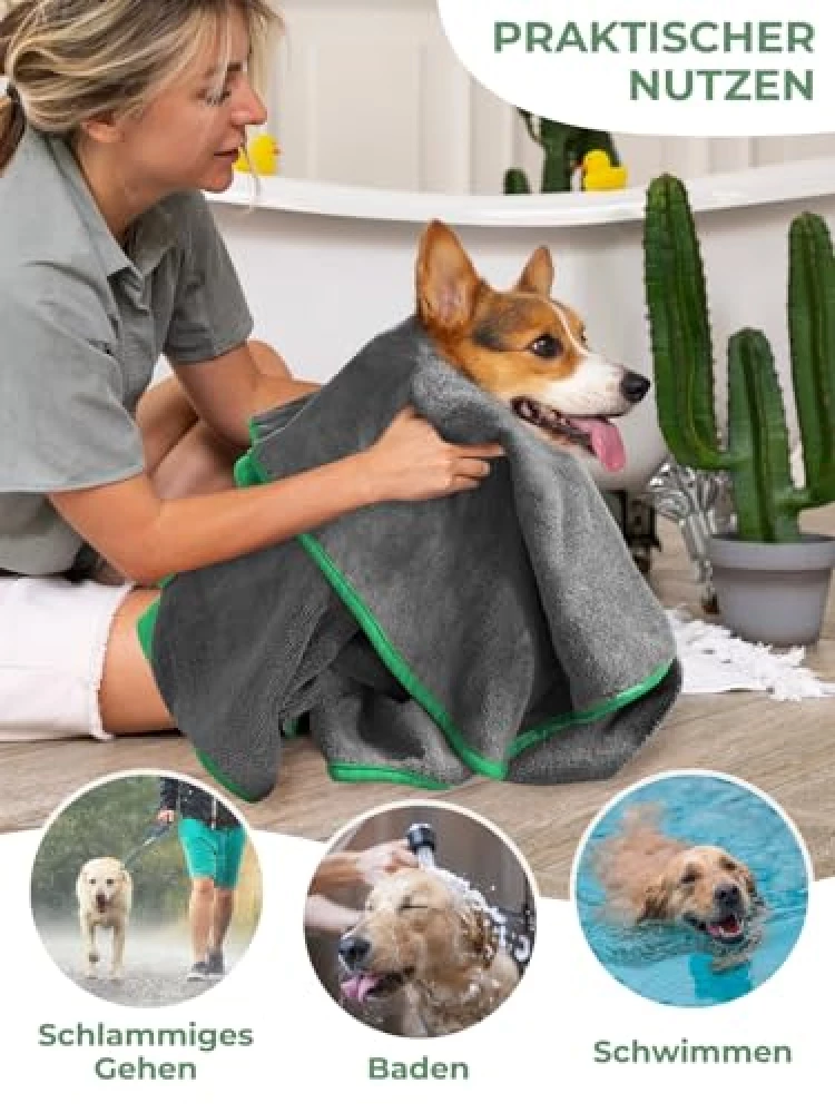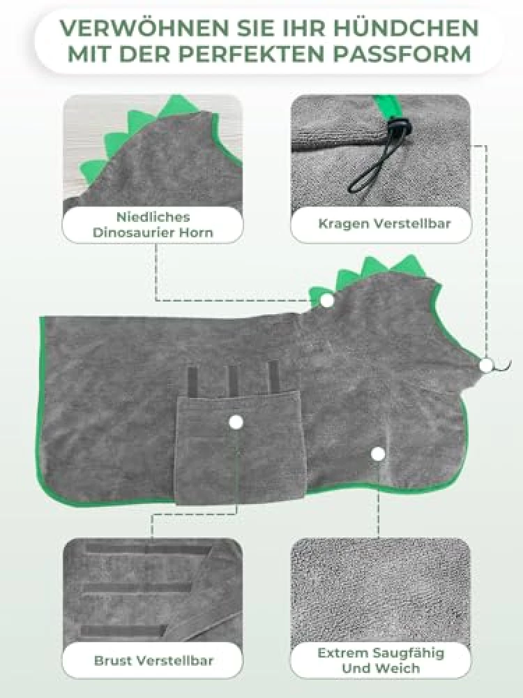 Das Anziehen ist ein Kinderspiel: Kopf durch, Klettverschluss zu, fertig. Der Bademantel lässt sich am Bauch individuell anpassen, sodass er weder zwickt noch rutscht. Sogar die wildesten Fellnasen lassen sich damit in Rekordzeit einkleiden. Die Dino-Rillen stören nicht, sondern sorgen für den gewissen Style-Faktor. Und falls dein Hund zu den Kandidaten gehört, die sich beim Föhnen lieber unter dem Sofa verstecken: Mit diesem Bademantel kann er einfach frei herumtollen und trocknen, ohne dass du ständig hinterherwischen musst. Wer will, kann den Bademantel sogar als Pyjama für besonders gemütliche Nächte nutzen – so bleibt das Erkältungsrisiko nach dem Baden minimal.