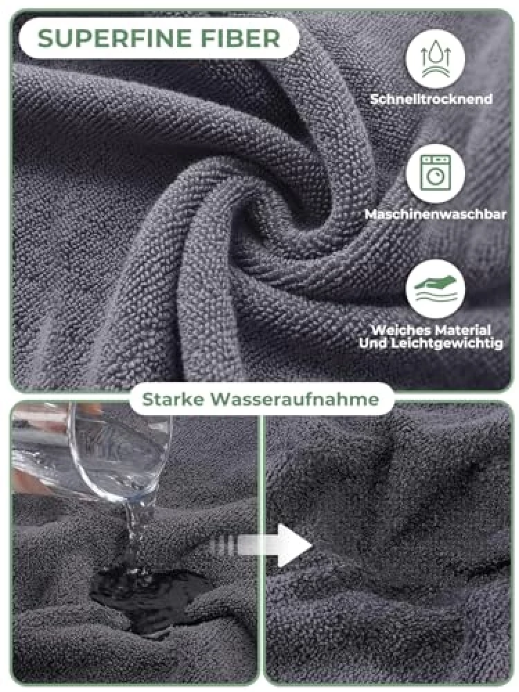 Die doppelte Mikrofaser-Schicht nimmt Wasser auf wie ein Schwamm auf Koffein. Selbst nach einem Regenspaziergang oder Bad bleibt das Fell angenehm trocken, und der Bademantel tropft nicht, wenn du ihn aufhängst.
