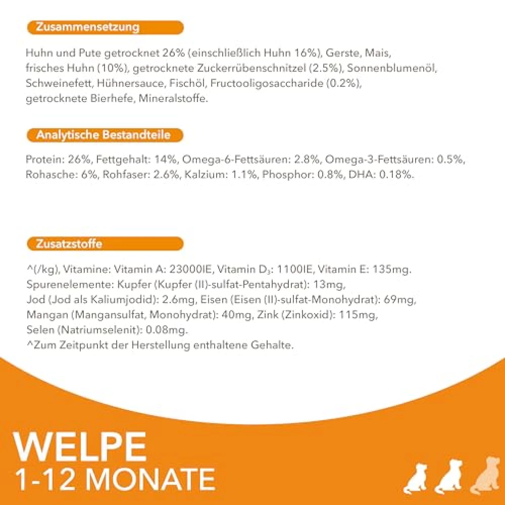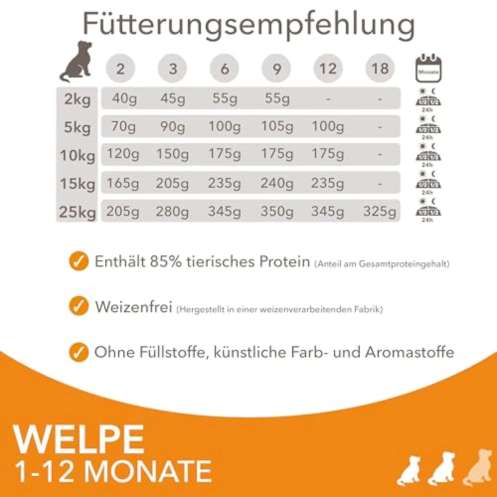 Du hast einen kleinen Welpen, der in den Startlöchern steht, die Welt zu erkunden? Das Futter für Welpen kleiner und mittelgroßer Rassen ist genau das Richtige für deinen vierbeinigen Freund. Mit stolzen 85 Prozent tierischem Protein sorgt es dafür, dass dein Welpe nicht nur kräftig wächst, sondern auch voller Energie steckt. Diese vollwertige und ausgewogene Nahrung wurde speziell für die Altersgruppe von 1 bis 12 Monaten entwickelt, sodass dein kleiner Schatz optimal versorgt wird.
