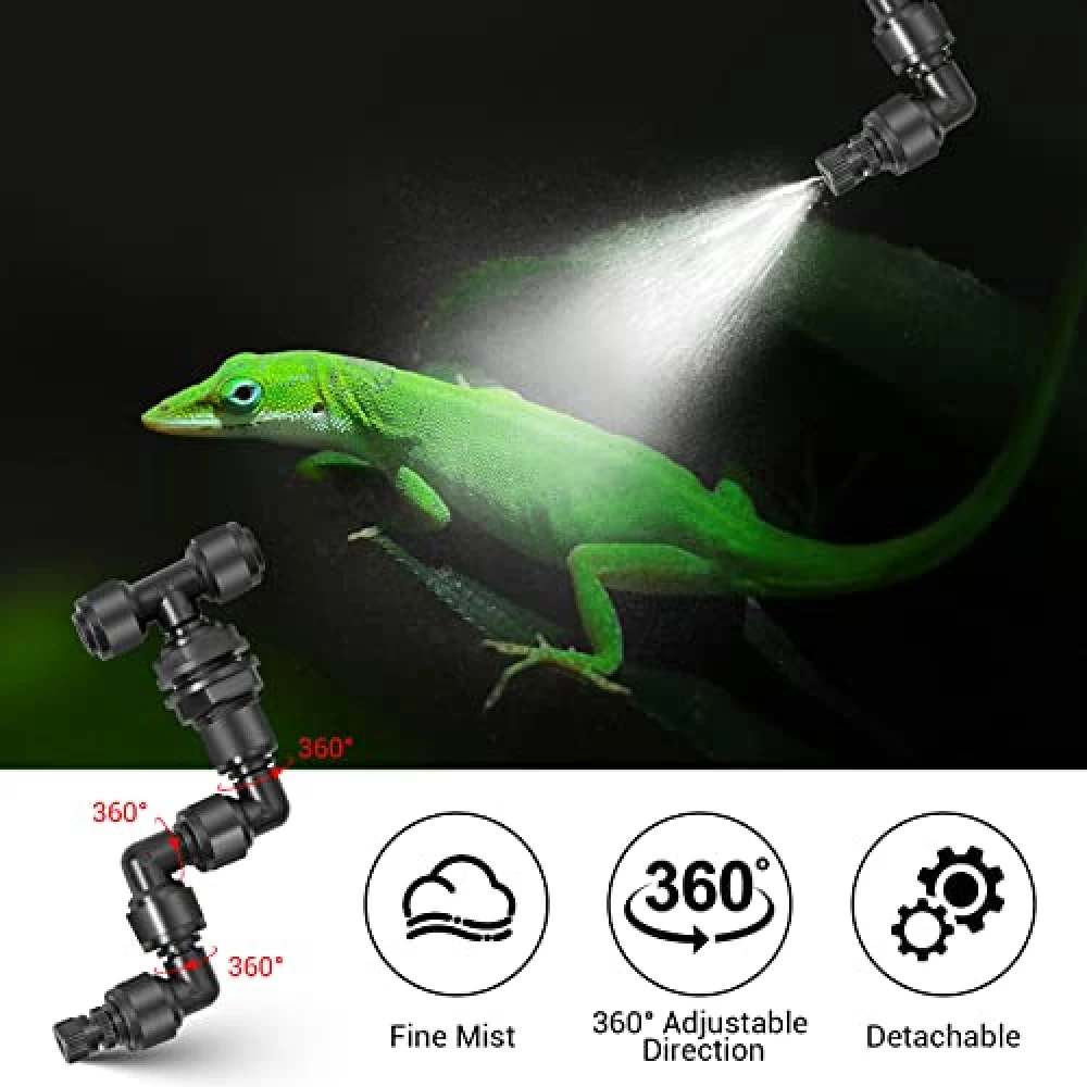Dank der 360°-drehbaren Düsen verteilst du das feine Sprühnebelchen punktgenau. Richte jeden Kopf flexibel aus und erreiche jede Ecke deines Terrariums – auch schwierige Winkel sind kein Problem.