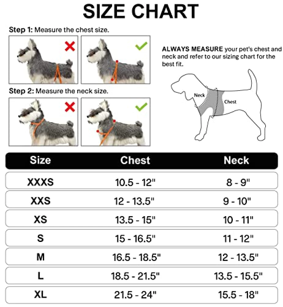 Am besten misst du den Brustumfang an der breitesten Stelle und den Halsumfang. So findest du die passende Größe. Achte darauf, nicht nur nach dem Gewicht zu gehen!