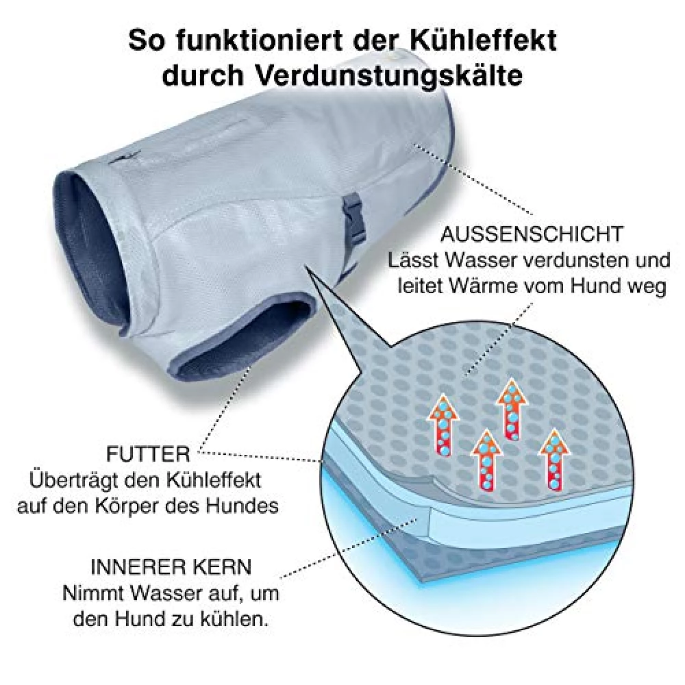 Die Weste nutzt den Effekt der Verdunstungskälte: Sie wird befeuchtet, leicht ausgewrungen und dann angezogen. Während das Wasser langsam verdunstet, entzieht es dem Hundekörper überschüssige Wärme. So bleibt dein Vierbeiner angenehm kühl, ohne dass das Fell nass wird.