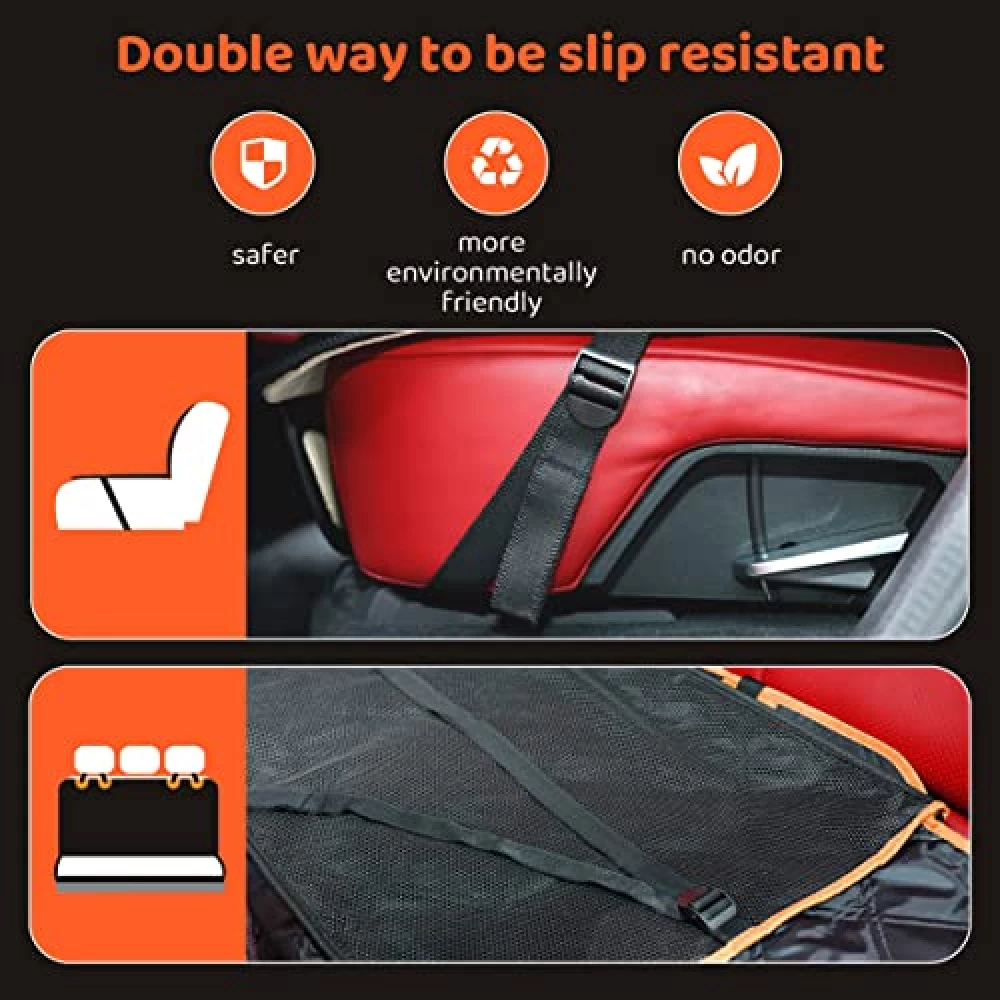 Keine Magie nötig: Die Decke hat ein cleveres rutschfestes Netz auf der Unterseite und wird mit Gurten an den Kopfstützen sowie elastischen Schlaufen fixiert. So bleibt sie auch bei wilden Sprüngen, Kurven oder plötzlichem Bremsen stabil.