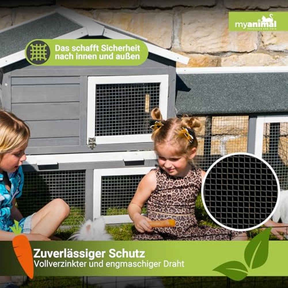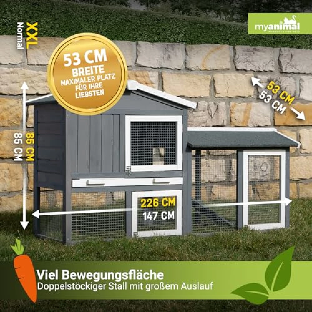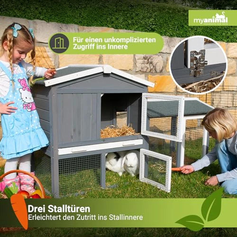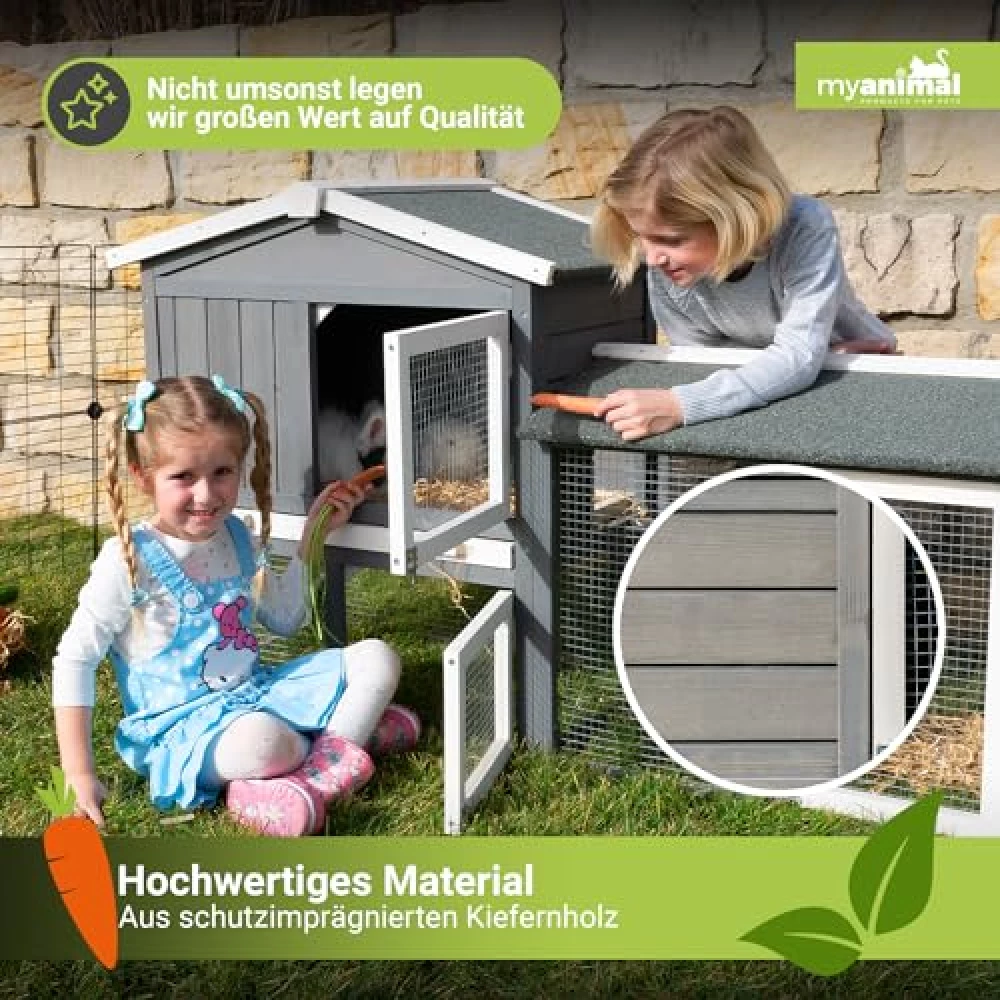 Drei Türen sorgen dafür, dass du überall hinkommst – sei es zum Füttern, Streicheln oder für den großen Auslauf-Check. Kein Akrobatik-Training nötig, kein mühsames Herumfummeln: Einfach Tür auf, Tier rein oder raus, fertig. Und weil der Stall so platzsparend gebaut ist (147 x 53 x 85 cm), passt er auch in kleinere Gärten oder auf die Terrasse, ohne dass du auf Bewegungsfreiheit für deine Tiere verzichten musst. Das großzügige Freilaufgehege ist der perfekte Abenteuerspielplatz – und falls du mehrere Tiere hast, werden sie sich über das Extra an Raum besonders freuen. Hier wird nicht gedrängelt, sondern gemeinsam gehoppelt!