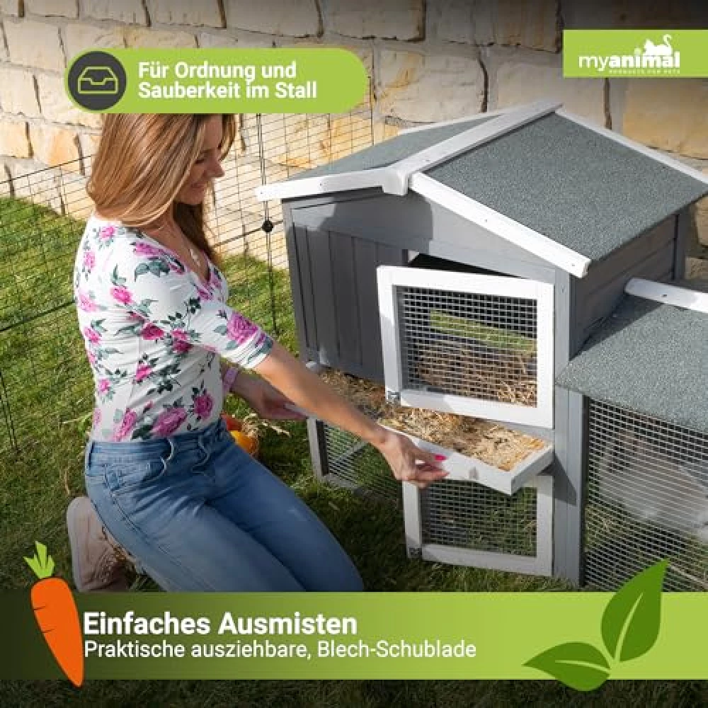 Die ausziehbare Schublade mit Stahlblech-Einlage sorgt dafür, dass du im Handumdrehen für Sauberkeit sorgst. Einfach rausziehen, säubern, wieder einschieben – und schon ist der Stall bereit für neue Abenteuer (oder ein Nickerchen).
