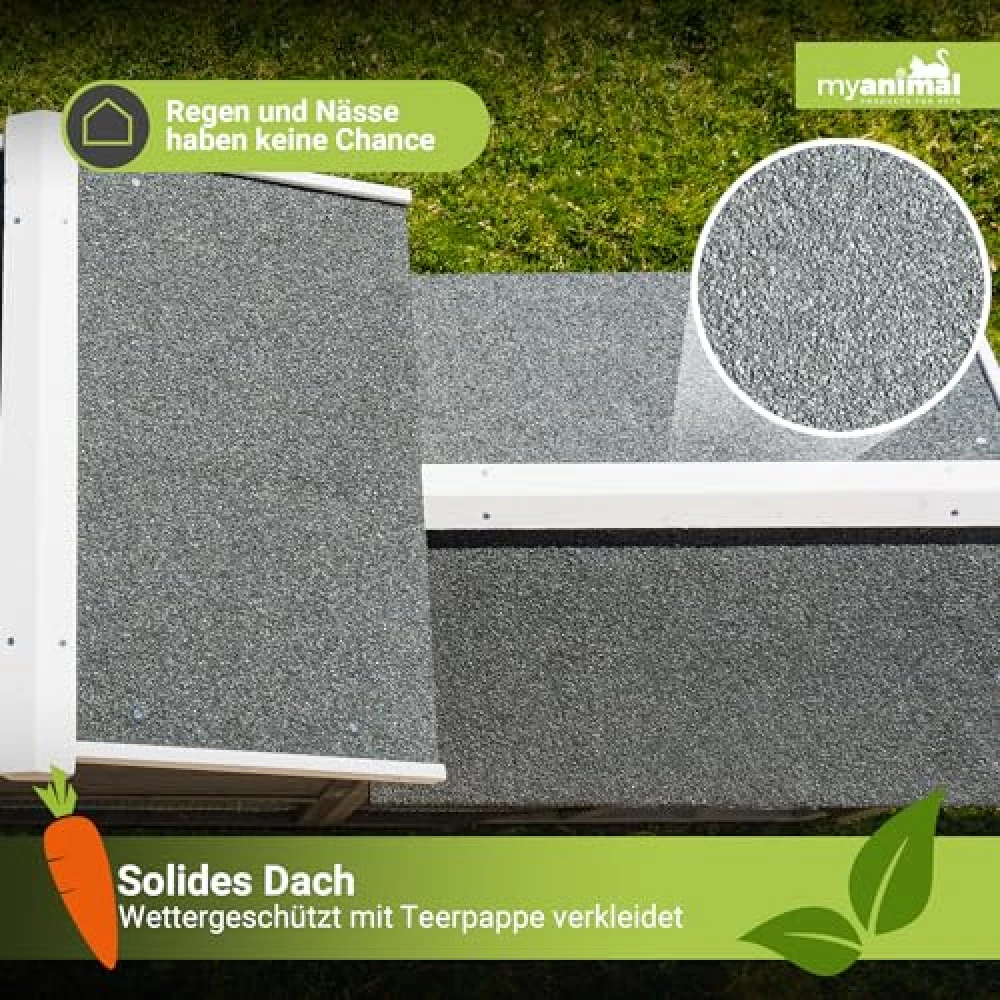 Das wasserabweisende Teerpappendach und das imprägnierte Kiefernholz trotzen Regen, Wind und sogar neugierigen Nachbarskatzen. Deine Tiere bleiben trocken und sicher, auch wenn draußen das Wetter Kapriolen schlägt.