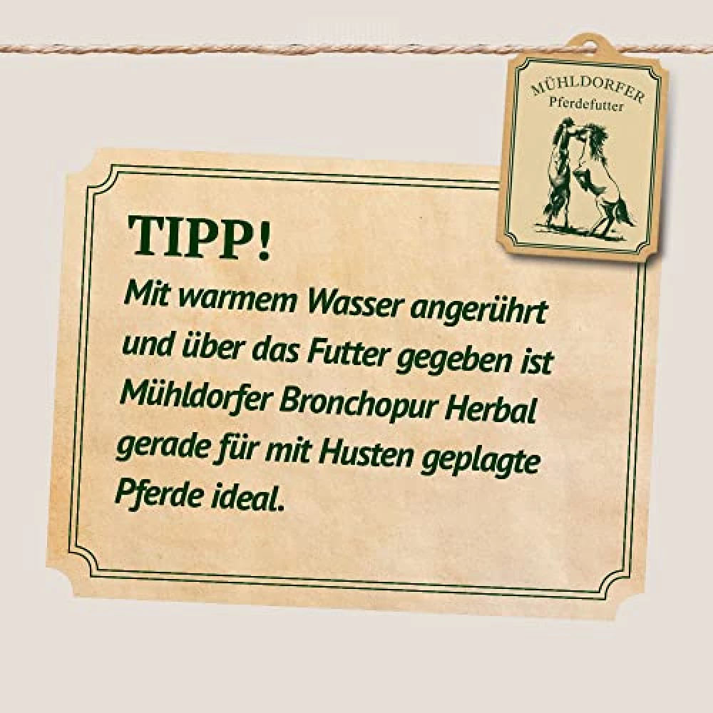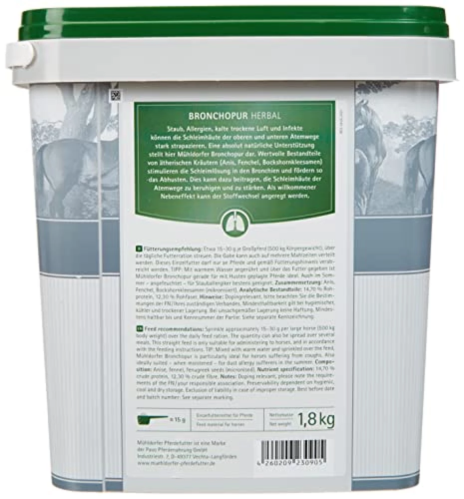 Ob eisiger Wind, trockene Heuluft oder die berühmte Staubwolke beim Ausmisten – Pferde sind echte Sensibelchen, wenn es um ihre Atemwege geht. Mühldorfer Bronchopur herbal ist der perfekte Begleiter durch alle Jahreszeiten: Im Winter als Schutzschild gegen Hustenwellen, im Sommer als Frischekick für Allergiker. Die enthaltenen Kräuter wirken nicht nur schleimlösend, sondern stärken auch die Schleimhäute und bringen den Stoffwechsel in Schwung. So bleibt dein Pferd fit, fröhlich und bereit für jedes Abenteuer – ob auf der Koppel oder im Viereck.[1][3][5]