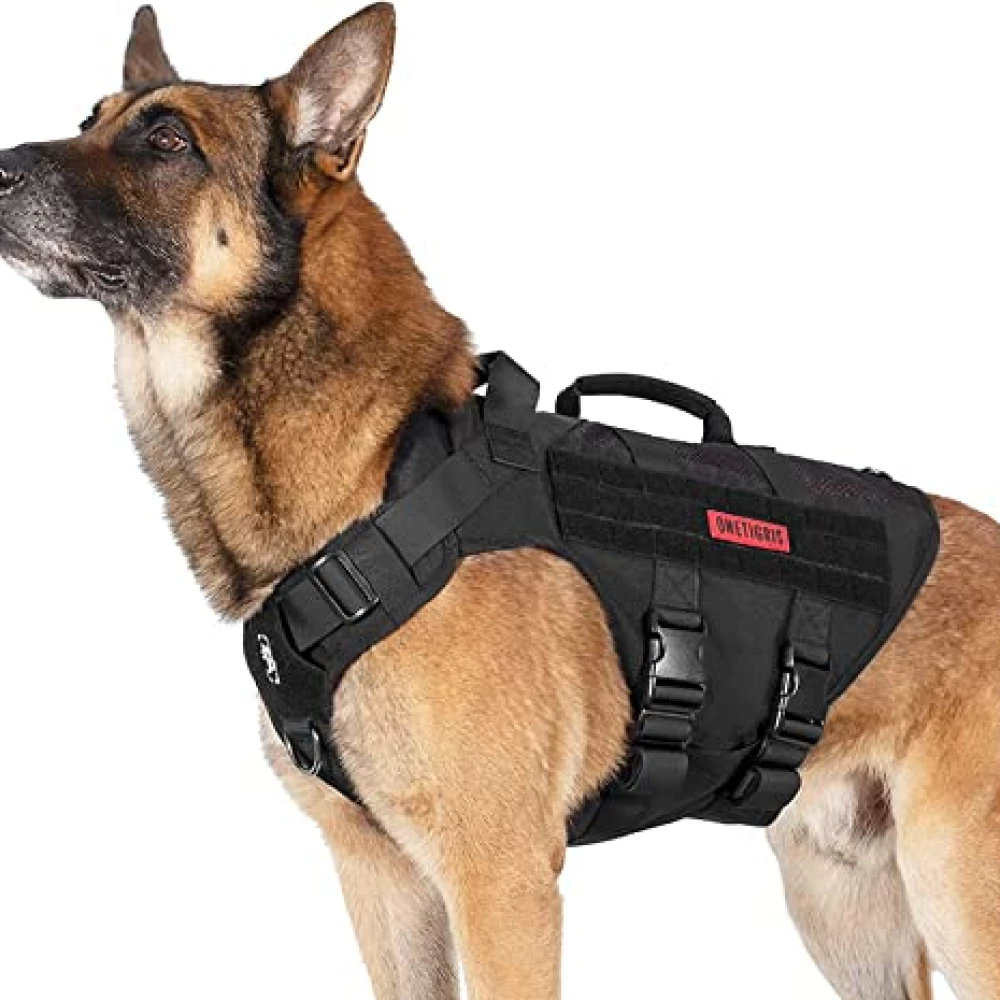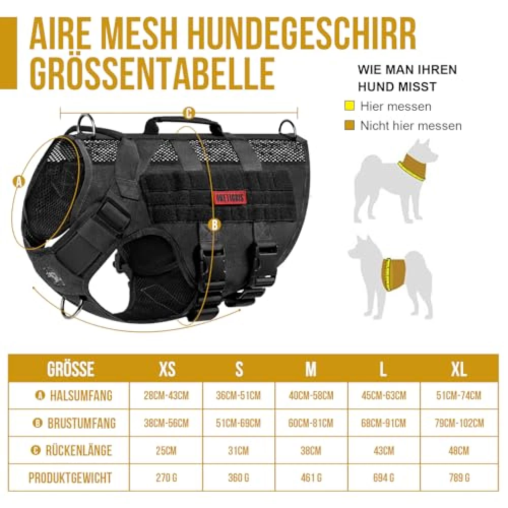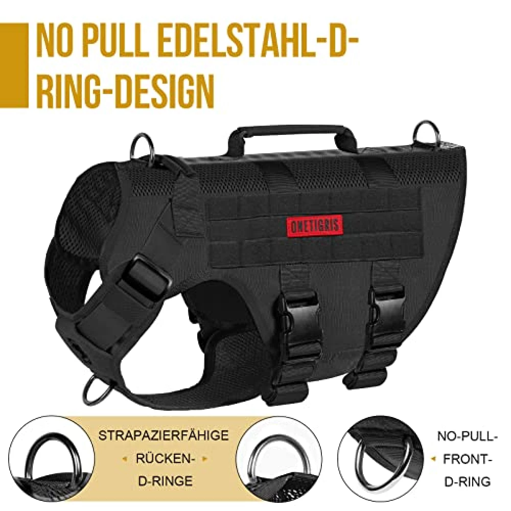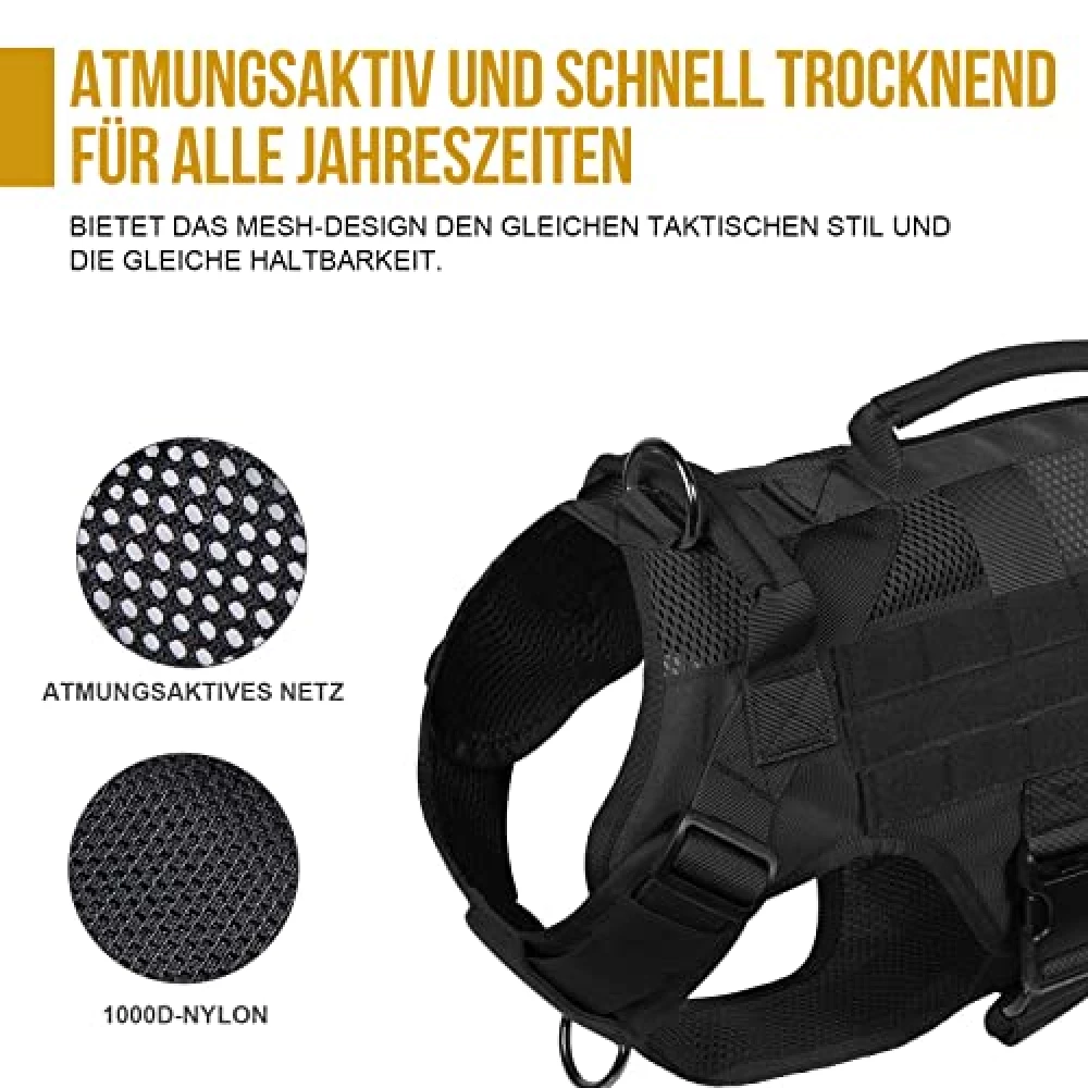 Das Molle-Design auf beiden Seiten des Geschirrs ist ein echtes Highlight. Hier kannst du allerlei Zubehör anbringen: Leckerli-Taschen, Kotbeuteltaschen oder sogar Militär-Patches. Die zwei gepolsterten Haltegriffe sind perfekt, um deinem Hund in belebten Situationen schnell Halt zu geben. Und wenn es darum geht, ihn ins Auto zu heben, wirst du die verstärkten Nähte zu schätzen wissen. Mit diesem Geschirr bist du für alles gewappnet!