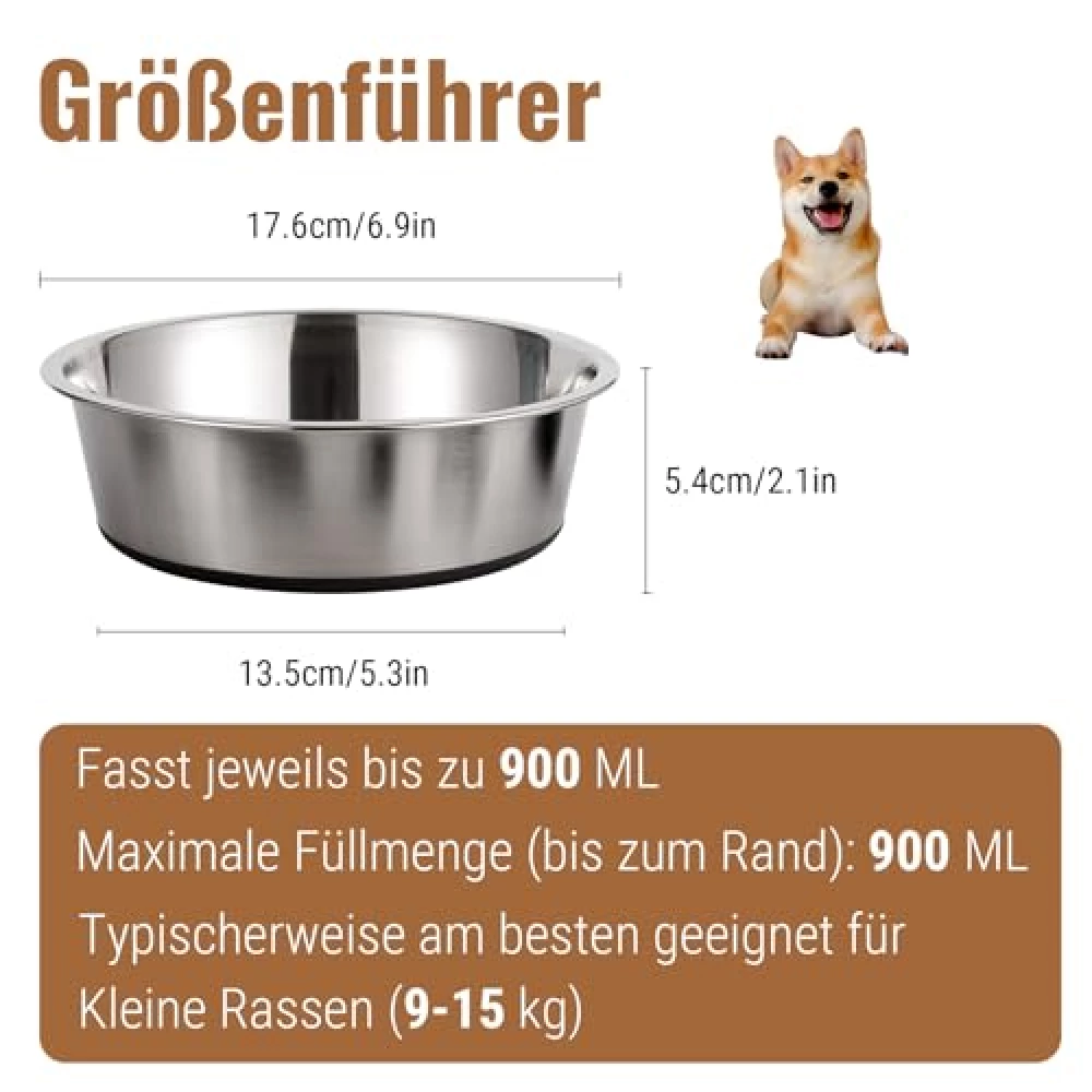 Mit 900 ml Fassungsvermögen und den Maßen 17,6 x 5,4 cm ist er ideal für kleine Rassen zwischen 9 und 15 kg. Große Hunde könnten sich beschweren, aber für kleine Genießer ist das die perfekte Portion.