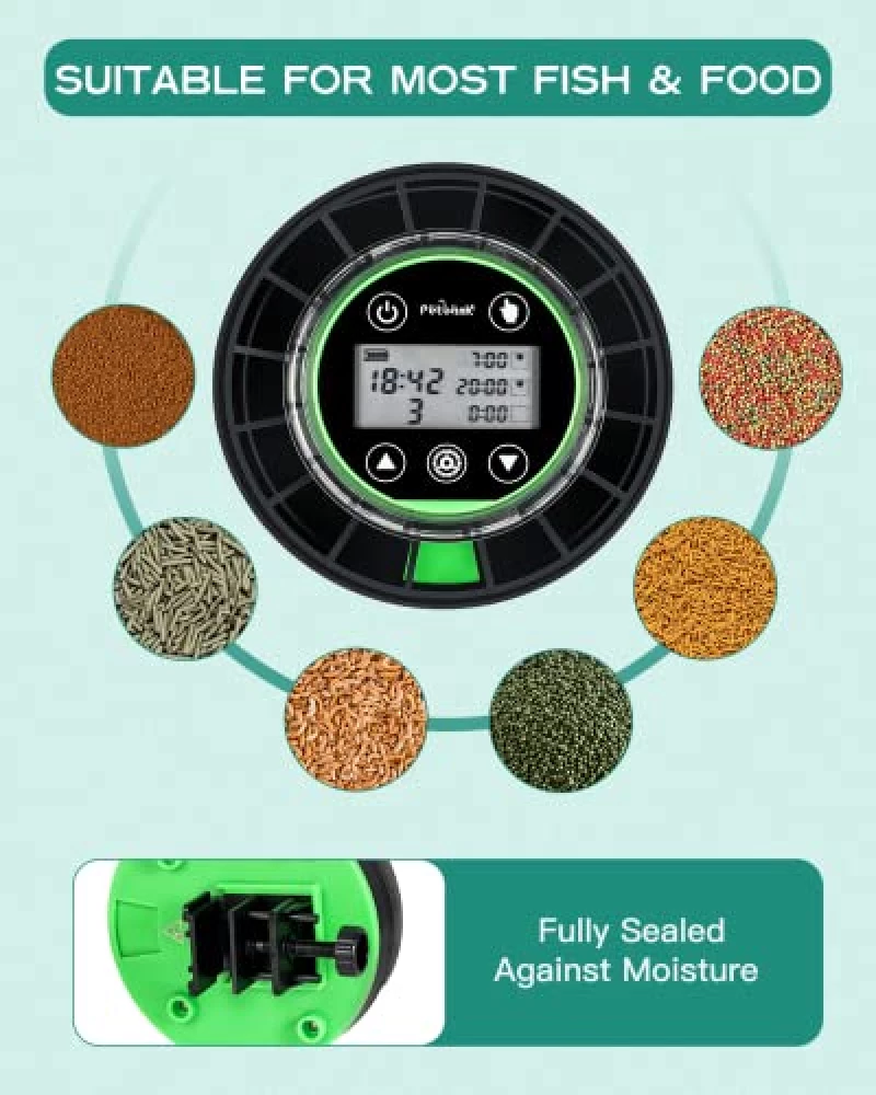 Die intelligente automatische Fütterung wird dir über den großen LCD-Bildschirm kinderleicht gemacht. Dort siehst du alle Parametereinstellungen auf einen Blick und kannst sie spielend leicht anpassen. Wie bereits erwähnt, sind bis zu drei Fütterungen pro Tag möglich, wobei jedes Mal bis zu drei einzelne Mahlzeiten (Fächer) ausgegeben werden können. Das ist perfekt, um den natürlichen Fressrhythmus vieler Fischarten zu simulieren, die in der Natur über den Tag verteilt immer wieder kleine Happen zu sich nehmen. Wenn du also 15 Mahlzeiten auf einmal einstellst, kannst du wirklich beruhigt in den Urlaub fahren oder ein langes Wochenende genießen, ohne dir Sorgen um deine schuppigen Freunde machen zu müssen. Stell dir die entspannte Heimkehr vor, wenn du weißt, dass deine Fische wohlgenährt und munter auf dich warten. Der Petbank Futterautomat ist also nicht nur ein praktischer Helfer im Alltag, sondern auch dein zuverlässigster Urlaubsvertreter für die Fischversorgung. Er ist quasi der unsichtbare Held, der im Hintergrund dafür sorgt, dass im Aquarium alles rund läuft und deine Fische glücklich und zufrieden ihre Bahnen ziehen können. Ein echter Gewinn für jeden Aquarienliebhaber, der seinen Tieren die beste Pflege zukommen lassen möchte, ohne dabei selbst zum Sklaven des Futterplans zu werden.