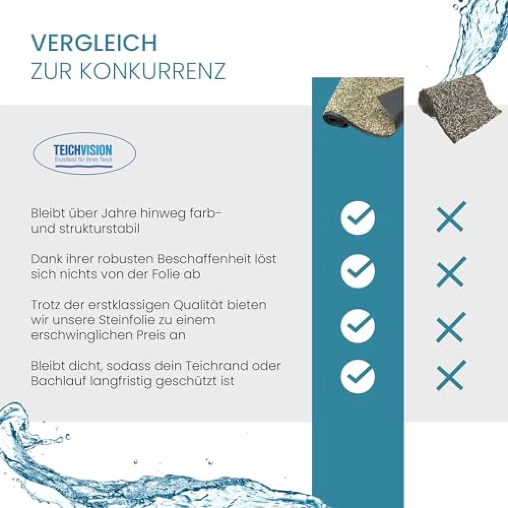 Nein, die Steinfolie ersetzt keine Teichfolie. Sie ist eine dekorative Schicht und sollte immer auf einer wasserdichten Teichfolie verlegt werden, um das Wasser im Teich zu halten.