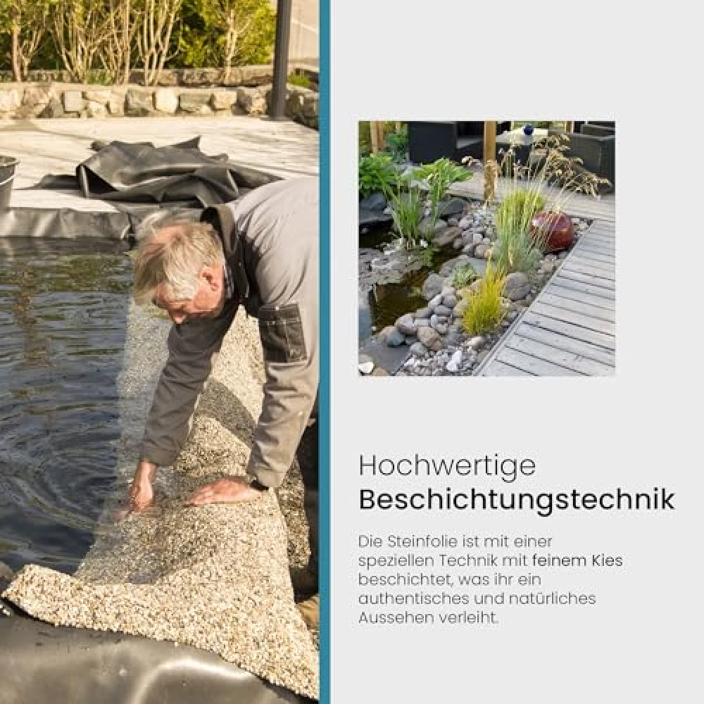 Die Steinfolie ist ein echtes Multitalent. Sie eignet sich nicht nur für Teichränder und Bachläufe, sondern auch für Steingärten, Gartenwege und sogar Teichränder mit Schwimmteichen. Du kannst sie flexibel zuschneiden und an unterschiedlichsten Stellen einsetzen, um deinem Garten ein stimmiges Gesamtbild zu verleihen. Dabei schützt sie auch das darunterliegende Teichvlies vor Witterungseinflüssen und sorgt für eine stabile Oberfläche. So kombinierst du Design und Funktionalität auf charmante Weise.