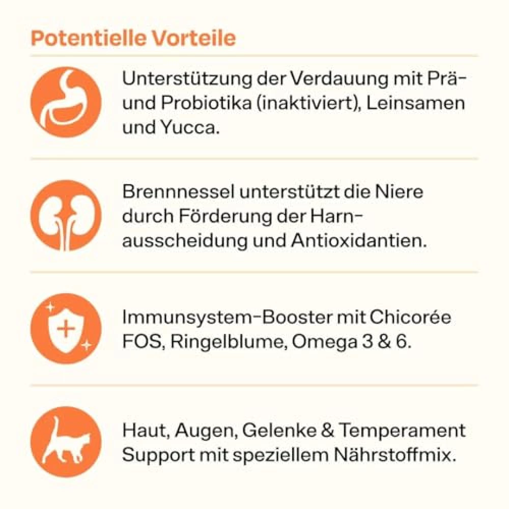 Probiotika sind die kleinen Helfer im Darm deiner Katze, die für ein gesundes Gleichgewicht sorgen. Sie helfen dabei, die gute Bakterienbilanz aufrechtzuerhalten und unterstützen eine geregelte Verdauung. Wenn die Verdauung stimmt, fühlt sich deine Katze rundum wohl und kann den Tag mit viel Energie meistern. Schließlich ist ein glücklicher Bauch der beste Freund einer glücklichen Katze.