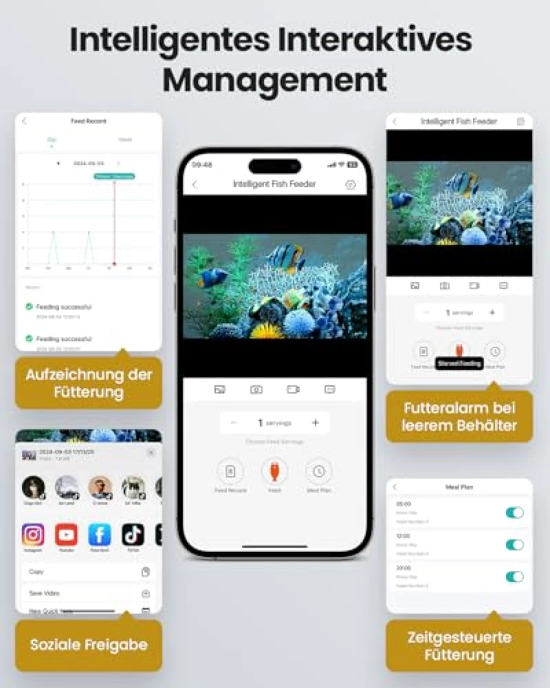 Mit der App legst du Fütterungszeiten und Portionen fest, schaust per Kamera ins Aquarium und bekommst sogar Benachrichtigungen, falls mal etwas nicht rund läuft. Und das Beste: Selbst wenn das WLAN ausfällt, läuft der Plan weiter – deine Fische merken nichts vom Technik-Drama.