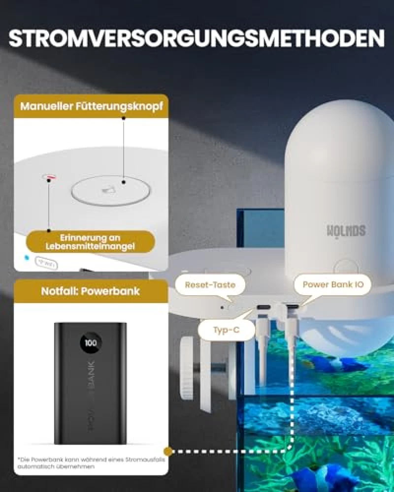 Einfach entspannen! Der große Futterbehälter reicht für bis zu 14 Tage, das feuchtigkeitsdichte Design hält alles frisch, und die Notstromversorgung per Powerbank springt ein, falls der Strom ausfällt. Deine Fische genießen also Rundum-Service, während du die Welt entdeckst.